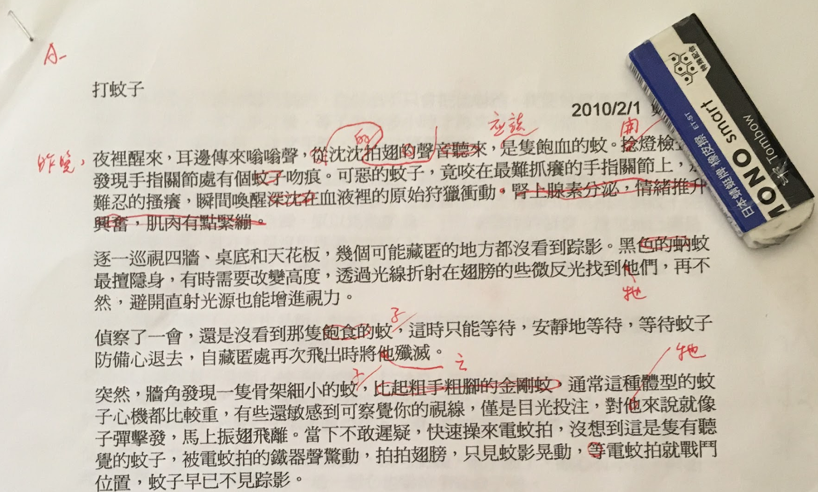 | 2010年上課作業,阿盛老師除用紅筆批閱,左上角還有分數呢! |